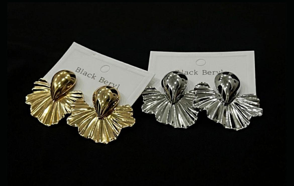 These are large, statement earrings featuring a two-part design: a rounded, smooth teardrop stud at the top, followed by a wide, pleated, fan-shaped bottom piece. The metal has a highly polished, liquid-metal finish, which is very reflective. They are presented in two tones: a bright gold-tone and a lustrous silver-tone (often called chrome or rhodium finish). The unique ruffling of the bottom piece gives them a distinct, artistic look.